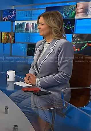 on NBC News Daily on NBC was spotted wearing this Christine Romans’ grey velvet suit on NBC News Daily on Jan 13 2026's episode. 's Jacket is the Madelyn blazer in velvet in Slate Blue by J. Crew . 's Pants is the Stella Pant in velvet in Slate Blue by J. Crew.