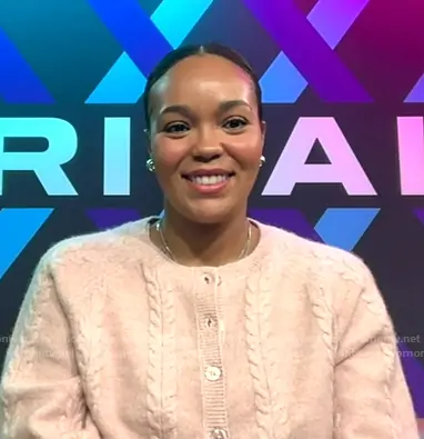 on Good Morning America on ABC was spotted wearing this blush pink knit cardigan on Good Morning America on Jan 05 2026's episode. 's Sweater is the Cable-Knit Cardigan in Light coral pink by H&M.