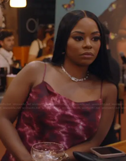 Keiarna Stewart on The Real Housewives of Potomac on Bravo was spotted wearing this pink tie dye cami on The Real Housewives of Potomac on episode 'Altitude with Attitude' (10x13) in Jan 2026. Keiarna's Top is the Tie Dye Marta Cami by Cinq a Sept.