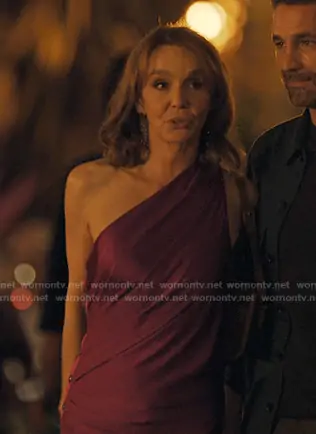 Sylvie (played by Philippine Leroy-Beaulieu) on Emily in Paris on Netflix was spotted wearing this purple one-shoulder dress on Emily in Paris on episode 'Got to be Real' (5x02) in Dec 2025. Sylvie's Dress is the Spring 2004 Collection by Lanvin . Sylvie's Bracelet is the Tracce Bracelet by Lucia Odescalchi . Sylvie's Ring is the Été Ring by Apm Monaco . Sylvie's Earring is the Temple Earrings by Lucia Odescalchi . Sylvie's Shoes is the Daniah 85 appliqué crêpe satin mules by Gianvito Rossi .