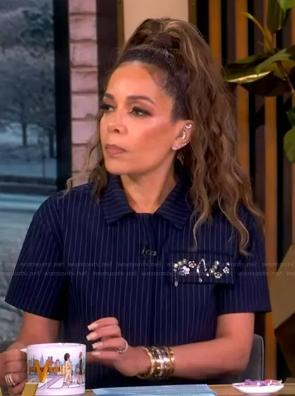 Sunny Hostin on The View on ABC was spotted wearing this navy pinstripe embellished top on The View on Jan 07 2026's episode. Sunny's Top is the Evelyn Top by Tanya Taylor . Sunny's Pants is the Adler Pant by Tanya Taylor.