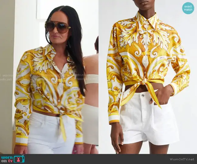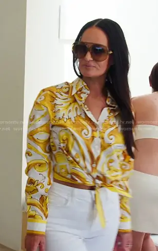 Lisa Barlow on The Real Housewives of Salt Lake City on Bravo was spotted wearing this yellow print tie front shirt on The Real Housewives of Salt Lake City on episode 'Sisters of Salt, A Greek Tragedy' (6x16) in Jan 2026. Lisa's Top is the Majolica Tie Hem Cotton Button-Up Shirt by dolce & Gabbana . Lisa's Sunglasses is the Curvy Aviator-Style Acetate Sunglasses by c.