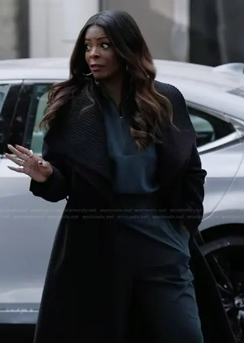 Ava Coleman (played by Janelle James) on Abbott Elementary on ABC was spotted wearing this black layered coat on Abbott Elementary on episode 'Mall' (5x09) in Jan 2026. Ava's Coat is the Rib Belted Wool Blend Wrap Coat with Bib by Donna Karan New York.