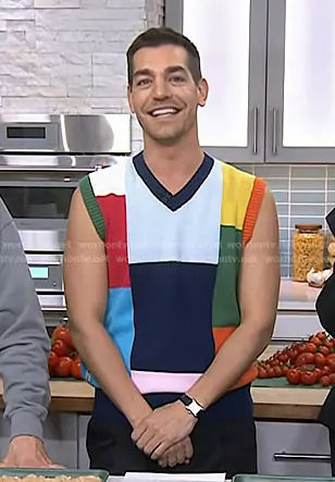 on Today on NBC was spotted wearing this Matt Rogers’ multicolor patchwork knit vest on Today on Jan 08 2026's episode. 's Sweater is the Cotton Patchwork Vest in Multicolor Block by Rowing Blazers . 's Shoes is the Dellow S-Strike Cup Sneakers by Stepney Workers Club.