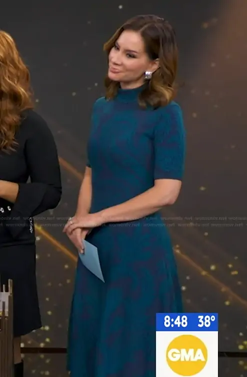 Rebecca Jarvis on Good Morning America on ABC was spotted wearing this blue paisley knit midi dress on Good Morning America on Mar 06 2026's episode. Rebecca's Dress is the Paisley A-Line Knit Midi-Dress in Petroleum by Etro.