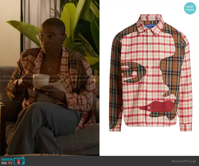 Henrietta Wilson (played by Aisha Hinds) on 9-1-1 on ABC was spotted wearing this mixed plaid shirt on 9-1-1 on episode 'Secrets' (9x07) in Jan 2026. Hen's Top is the Patchwork Face Flannel Shirt by KidSuper.