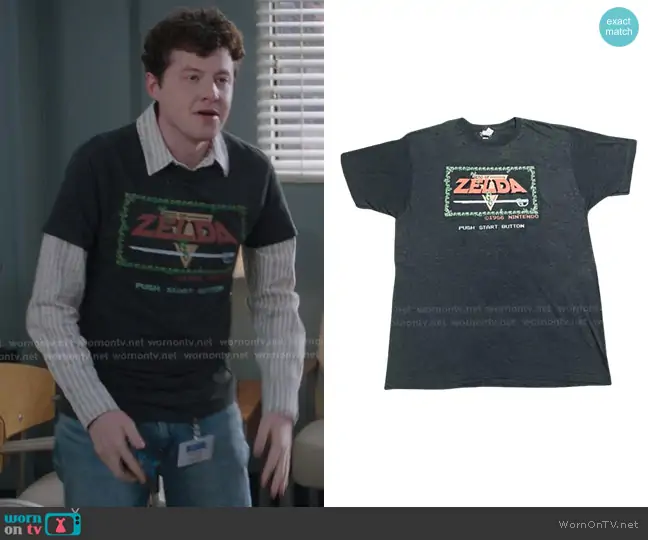 (played by ) on Greys Anatomy on ABC was spotted wearing this black Zelda print tee on Greys Anatomy on episode 'Skyfall' (22x07) in Jan 2026. 's Shirt is the Vintage 1986 Nitendo Zelda Title Screen T-Shirt.