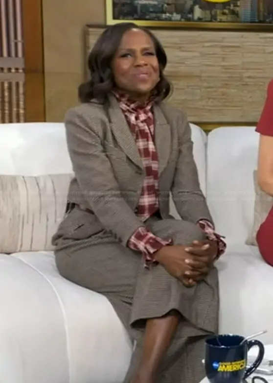 Deborah Roberts on Good Morning America on ABC was spotted wearing this red plaid blouse on Good Morning America on Jan 09 2026's episode. Deborah's Top is the Pussy-bow ruched checked silk blouse by Saint Laurent.
