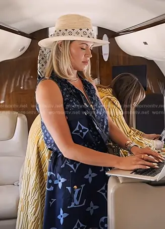 Amanda Frances on The Real Housewives of Beverly Hills on Bravo was spotted wearing this blue monogram print zip front dress on The Real Housewives of Beverly Hills on episode 'Housewives Heatwave' (15x04) in Jan 2026. Amanda's Dress is the Zip Front Silk Dress by Louis Vuitton . Amanda's Hat is the Monogram Wave Hat by Louis Vuitton.