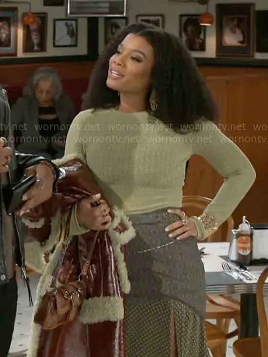 Eva Thomas (played by Ambyr Michelle) on Beyond the Gates on CBS was spotted wearing this green pointelle knit sweater and printed skirt on Beyond the Gates on Jan 11 2026's episode. Eva's Skirt is the Giorgia Skirt by House of Harlow 1960 . Eva's Coat is the Sherpa-Trim Faux-Leather Coat by Anna Sui . Eva's Earrings is the Hettie Dangle Earrings by Free People . Eva's Bag is the Jade Laced Rivet Bag by Silence + Noise at Urban Outfitters.