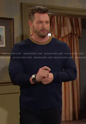 Brady Black (played by Eric Martsolf) on Days of our Lives on Peacock was spotted wearing this navy ribbed sweater on Days of our Lives on Jan 12 2026's episode. 's Sweater is the Nayor Ribbed Crewneck Sweater by Ted Baker.
