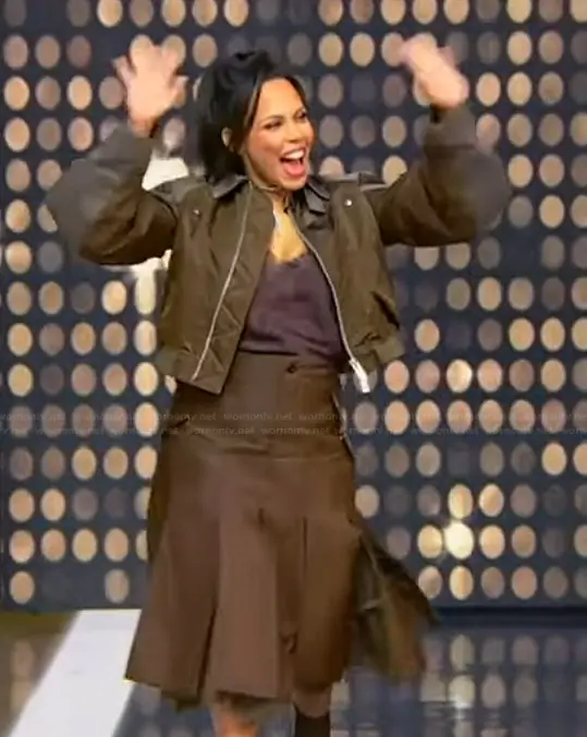 on Tamron Hall Show on ABC was spotted wearing this satin bomber jacket and skirt on Tamron Hall Show on Jan 12 2026's episode. 's Jacket is the two-way zip fastening jacket by Sacai . 's Skirt is the Nylon Twill Skirt by Sacai.