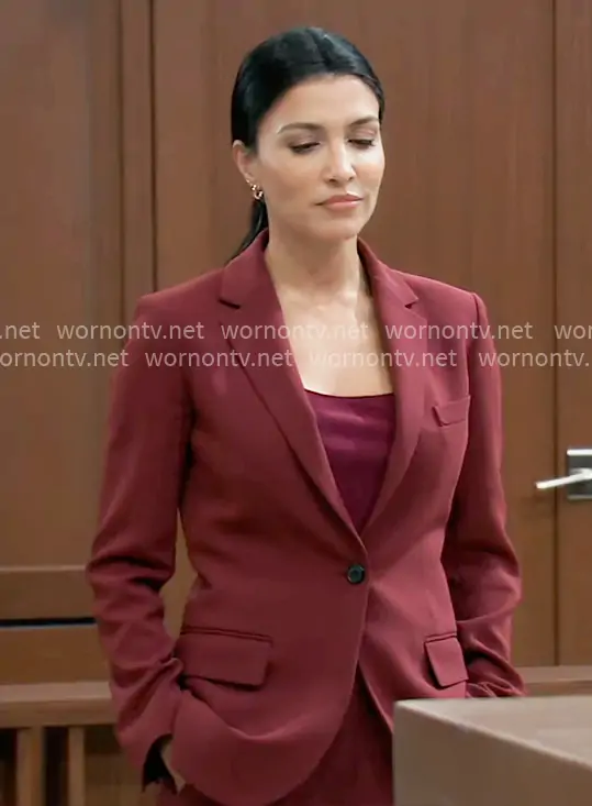 Justine Turner (played by Nazneen Contractor) on General Hospital on ABC was spotted wearing this burgundy suit on General Hospital on Jan 12 2026's episode. Justine's Jacket is the Staple Blazer in Admiral Crepe in Grenache by Theory . Justine's Pants is the Treeca Full Length Pant in Admiral Crepe in Grenache by Theory.