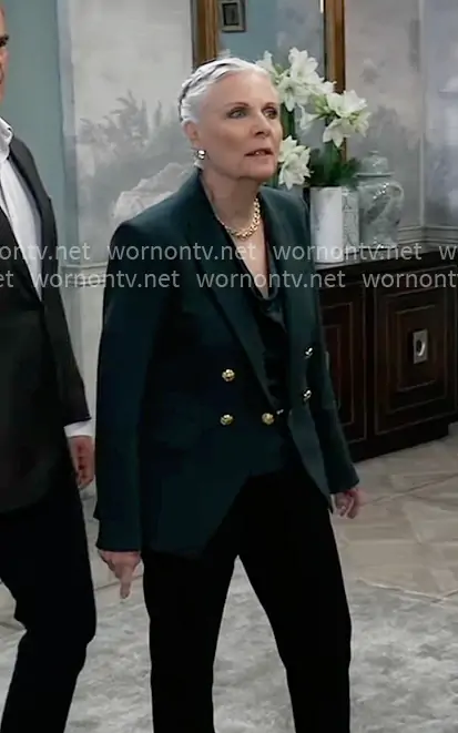 Tracy Quartermaine (played by Jane Elliot) on General Hospital on ABC was spotted wearing this green blazer with gold buttons on General Hospital on Jan 12 2026's episode. Tracy's Jacket is the Miller Jacket in Pine by Veronica Beard .