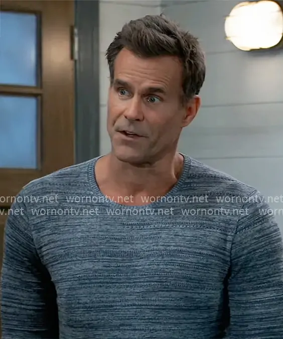 Drew Cain (played by Cameron Mathison) on General Hospital on ABC was spotted wearing this blue marled sweater on General Hospital on Jan 12 2026's episode. 's Sweater is the Erik Slim Fit Space Dyed Sweater by John Varvatos .