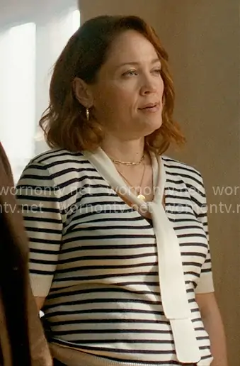 Angie Polaski (played by Erika Christensen) on Will Trent on ABC was spotted wearing this striped tie-neck sweater on Will Trent on episode '... Speaking of Sharks' (4x01) in Jan 2026. Angie's Top is the The Sailor Tie Cardi by Frame.
