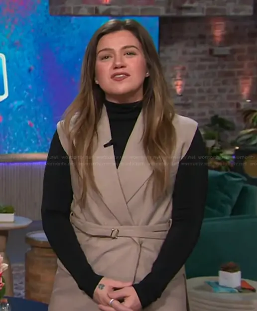Kelly Clarkson on The Kelly Clarkson Show on NBC was spotted wearing this beige belted waistcoat on The Kelly Clarkson Show on Jan 13 2026's episode. Kelly's Vest is the Oversized belted grain de poudre wool vest by Sportmax.