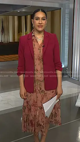 Morgan Radford on NBC News Daily on NBC was spotted wearing this pink floral dress and ruched sleeve blazer on NBC News Daily on Jan 13 2026's episode. Morgan's Dress is the Luminosity Flutter Dress by Zimmermann . Morgan's Jacket is the Khloe Blazer by Cinq a Sept.