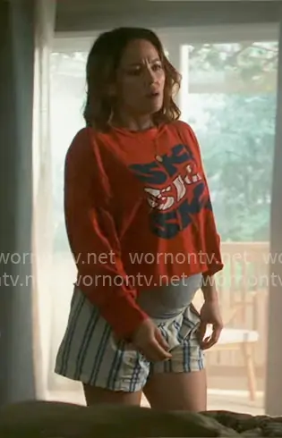 Angie Polaski (played by Erika Christensen) on Will Trent on ABC was spotted wearing this red ski graphic tee and striped shorts on Will Trent on episode 'Love Takes Time' (4x02) in Jan 2026. Angie's Top is the Inspire Long Sleeve Cotton Graphic T-Shirt by Free People . Angie's Shorts is the Get Free Striped Pull On Shorts in Ivory Combo by Free People.