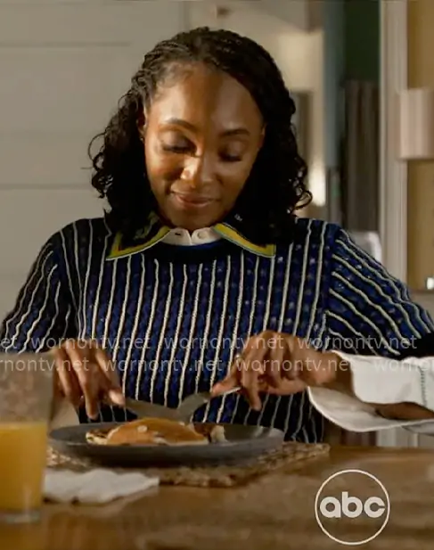 Faith Mitchell (played by Iantha Richardson) on Will Trent on ABC was spotted wearing this blue striped sweater and embroidered shirt on Will Trent on episode 'Love Takes Time' (4x02) in Jan 2026. Faith's Top is the Concord Shirt in White by Jupe by Jackie . Faith's Sweater is the Apu Knitted Top in Electric Blue - Black by Escvdo.