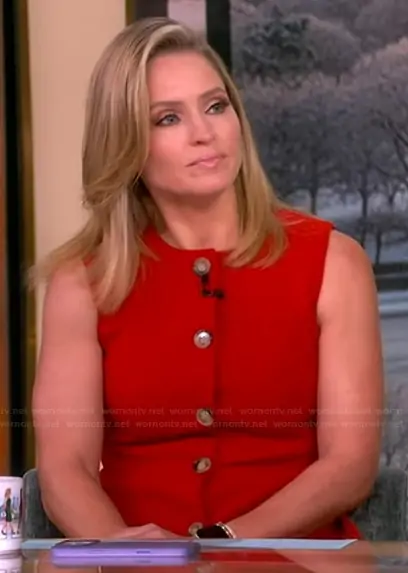 Sara Haines on The View on ABC was spotted wearing this red button vest and pants on The View on Jan 14 2026's episode. Sara's Vest is the Jessup Tailored Vest by Veronica Beard . Sara's Pants is the Stila Pants by Veronica Beard.