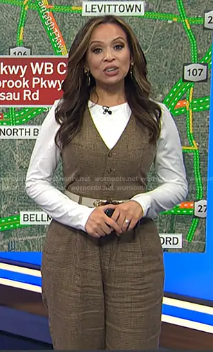 Adelle Caballero on Today on NBC was spotted wearing this brown check sleeveless jumpsuit on Today on Jan 15 2026's episode. Adelle's Jumpsuit is the Houndstooth Belted Linen Jumpsuit by Lauren Ralph Lauren.