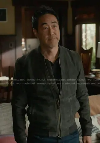 Howard Han (played by Kenneth Choi) on 9-1-1 on ABC was spotted wearing this dark green suede jacket on 9-1-1 on episode 'War' (9x08) in Jan 2026. 's Jacket is the Brick Suede Zip-Through Bomber Jacket in Antique Dark Forest Green by Reiss.