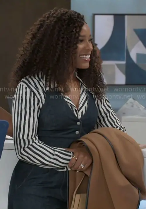 Naomi Hamilton Hawthorne (played by Arielle Prepetit) on Beyond the Gates on CBS was spotted wearing this striped shirt and denim jumpsuit on Beyond the Gates on Jan 15 2026's episode. Naomi's Top is the Stripe Button Front Shirt by Mango . Naomi's Jumpsuit is the Isadore Denim Jumpsuit by Amanda Uprichard . Naomi's Coat is the Juliette Wool Blend Belted Wrap Coat in Caramel by Tahari.