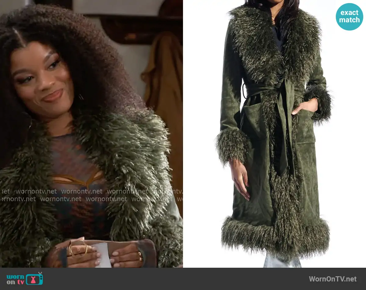Eva Thomas (played by Ambyr Michelle) on Beyond the Gates on CBS was spotted wearing this green fur collar coat on Beyond the Gates on Jan 15 2026's episode. Eva's Coat is the Belted Faux Suede Coat with Faux Fur Trim by Azalea Wang.