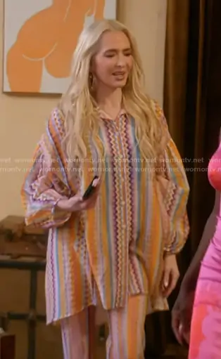 Erika Jayne on The Real Housewives of Beverly Hills on Bravo was spotted wearing this zig zag print oversized shirt and pants on The Real Housewives of Beverly Hills on episode 'Not Feeling the Healing' (15x05) in Jan 2026. Erika's Top is the Mare Striped Cotton and Silk-blend Coverup by Missoni . Erika's Pants is the Striped Printed Stretch-tulle Straight-leg Pants by Missoni.