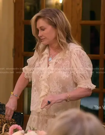 Kathy Hilton on The Real Housewives of Beverly Hills on Bravo was spotted wearing this white ruffle lace blouse and skirt on The Real Housewives of Beverly Hills on episode 'Not Feeling the Healing' (15x05) in Jan 2026. Kathy's Top is the Henri Lace Top by Doen . Kathy's Skirt is the Sebastiane Tiered Lace Skirt by Doen.