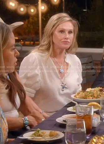 Kathy Hilton on The Real Housewives of Beverly Hills on Bravo was spotted wearing this white lace inset top on The Real Housewives of Beverly Hills on episode 'Not Feeling the Healing' (15x05) in Jan 2026. Kathy's Top is the The Ruffle Collar Top by Frame.