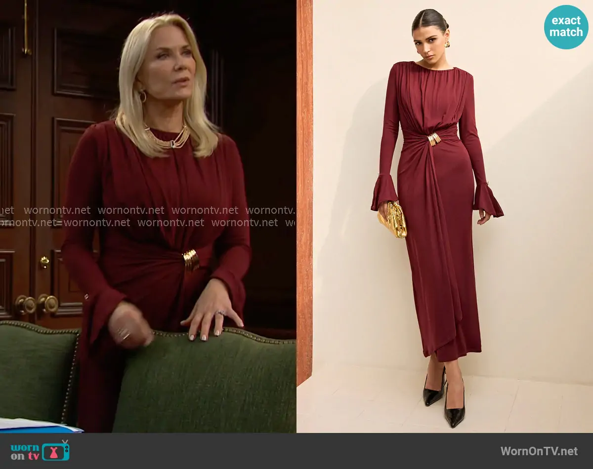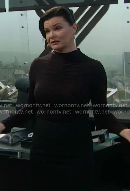 Katie Logan (played by Heather Tom) on The Bold and the Beautiful on CBS was spotted wearing this ruched front top on The Bold and the Beautiful on Jan 16 2026's episode. Katie's Top is the Theresa Ruched Turtleneck by Veronica Beard.
