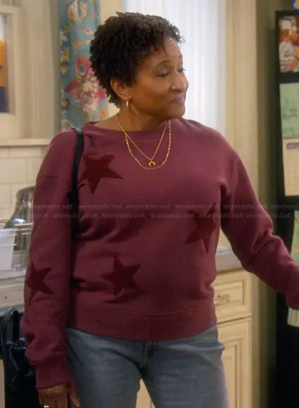 Lucretia Turner (played by Wanda Sykes) on The Upshaws on Netflix was spotted wearing this maroon star sweater on The Upshaws on episode 'Indy Streets' (7x04) in Jan 2026. Lucretia's Sweater is the Sonia sweatshirt by Rails.