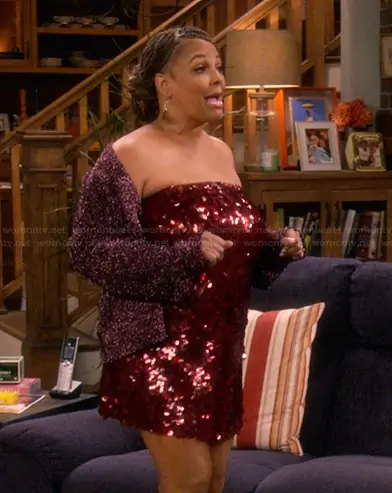 Regina Upshaw (played by Kim Fields) on The Upshaws on Netflix was spotted wearing this burgundy sequin strapless dress on The Upshaws on episode 'Indy Streets' (7x04) in Jan 2026. Regina's Dress is the Nolia Sequin Embellished Dress by Retrofete.