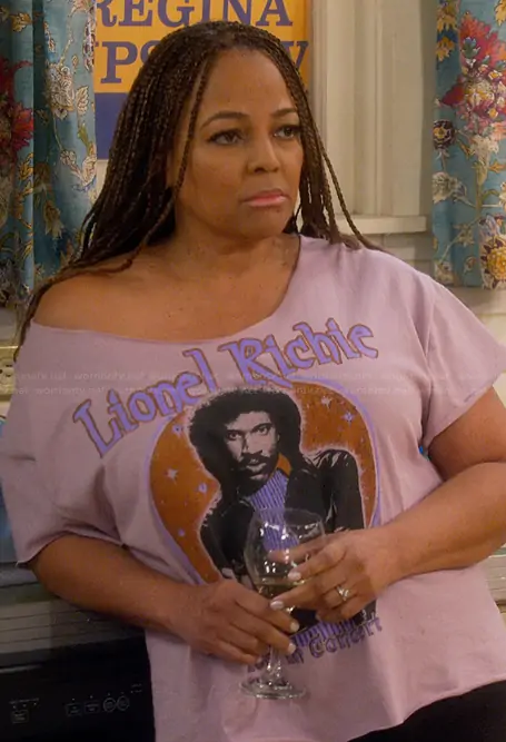 Regina Upshaw (played by Kim Fields) on The Upshaws on Netflix was spotted wearing this Lionel Richie on episode 'Indy Streets' (7x04) in Jan 2026. Regina's Top is the Lionel Richie Graphic Tee by Forever 21.