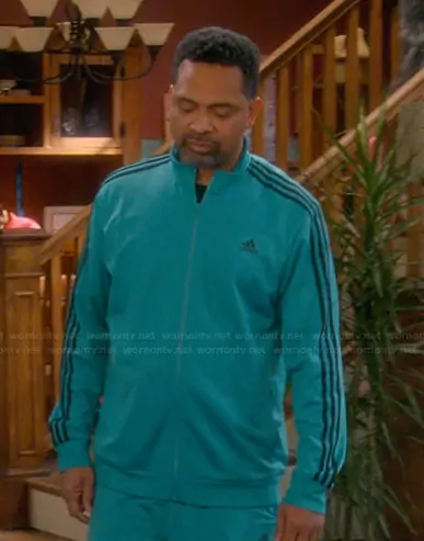 Bernard Upshaw (played by Mike Epps) on The Upshaws on Netflix was spotted wearing this teal track jacket on The Upshaws on episode 'Cold Shoulder' (7x05) in Jan 2026. Bennie's Jacket is the 3-Stripes Warm-Up Sportswear Track Jacket by Adidas.