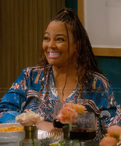 Regina Upshaw (played by Kim Fields) on The Upshaws on Netflix was spotted wearing this blue printed top on The Upshaws on episode 'Cold Shoulder' (7x05) in Jan 2026. Regina's Bodysuit is the Disco Baby Bodysuit Blouse by Akira.
