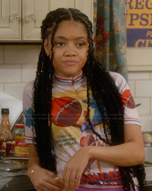 Aaliyah Upshaw (played by Khali Spraggins) on The Upshaws on Netflix was spotted wearing this cycling jersey top on The Upshaws on episode 'Cold Shoulder' (7x05) in Jan 2026. Aaliyah's Top is the Retro La Francaise Diamant Cycling Jersey by Freestyle Clothing.