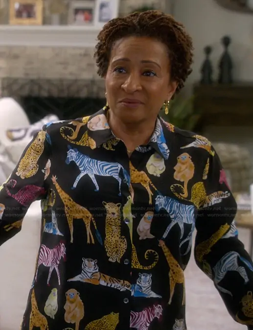 Lucretia Turner (played by Wanda Sykes) on The Upshaws on Netflix was spotted wearing this animal print blouse on The Upshaws on episode 'Hole-y Hell' (7x06) in Jan 2026. Lucretia's Top is the Kate Shirt in Illustrated Animals Blouse by Rails.