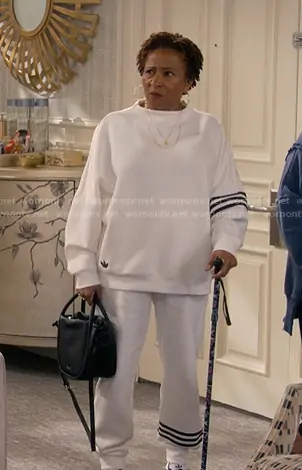 Lucretia Turner (played by Wanda Sykes) on The Upshaws on Netflix was spotted wearing this Lucretia’s white oversized sweatshirt and sweatpants on The Upshaws on episode 'Great Points' (7x07) in Jan 2026. Lucretia's Sweater is the Neucl Oversized Sweat in Cloud White by Adidas . Lucretia's Pants is the Neuclassics Sweatpants in Cloud White by Adidas . Lucretia's Shoes is the Gazelle Shoes Collegiate Navy / White / Gold Metallic by Adidas.
