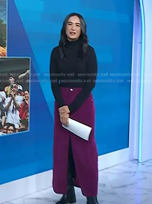 Emilie Ikeda on Today on NBC was spotted wearing this purple corduory skirt on Today on Jan 19 2026's episode. Emilie's Skirt is the The Madi Front-Slit Corduroy Skirt in Purple by Pilcro.