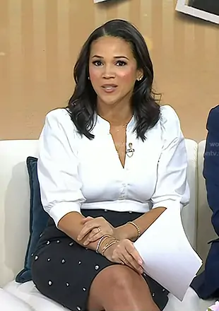 Laura Jarrett on Today on NBC was spotted wearing this white puff sleeve top and black embellished skirt on Today on Jan 19 2026's episode. Laura's Top is the Coralee Top by Veronica Beard . Laura's Skirt is the Opal Rhinestone Pencil Skirt by A.L.C..