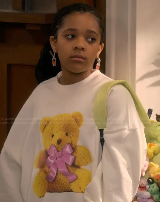 Maya Upshaw (played by Journey Christine) on The Upshaws on Netflix was spotted wearing this teddy bear graphic sweatshirt on The Upshaws on episode 'Worked Up' (7x08) in Jan 2026. Maya's Sweater is the Teddy Bear Graphic Pullover by Forever 21 . Maya's Earrings is the Gold Fish Dangle Earrings by Jiu Lai Yin at Amazon.