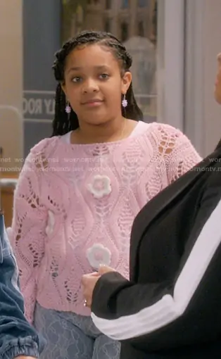 Maya Upshaw (played by Journey Christine) on The Upshaws on Netflix was spotted wearing this pink open knit floral sweater on The Upshaws on episode 'Great Points' (7x07) in Jan 2026. Maya's Sweater is the Boat Neck Long Sleeve Floral Sweater by Forever 21.