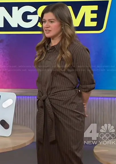 Kelly Clarkson on The Kelly Clarkson Show on NBC was spotted wearing this brown stripe tie front dress on The Kelly Clarkson Show on Jan 20 2026's episode. Kelly's Dress is the Mila Pinstripe Draped Shirtdress by A.L.C..