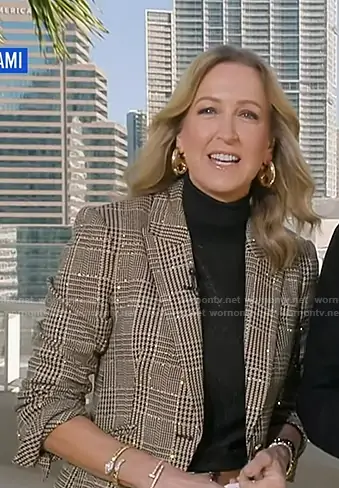 Lara Spencer on Good Morning America on ABC was spotted wearing this beige houndstooth embellished blazer on Good Morning America on Jan 20 2026's episode. Lara's Jacket is the Kendryn Embellished Dickey Jacket by Veronica Beard.