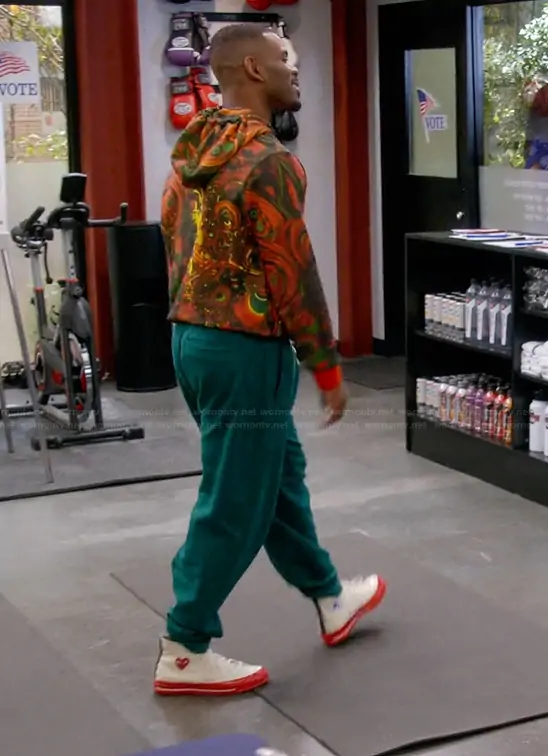 Bernard Upshaw Jr (played by Jermelle Simon-Jones) on The Upshaws on Netflix was spotted wearing this white canvas high top sneakers on The Upshaws on episode 'Election Day' (7x09) in Jan 2026. Bernard's Shoes is the X CdG Play Chuck 70 High Pristine Red sneakers by Converse.
