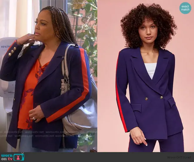 Regina Upshaw (played by Kim Fields) on The Upshaws on Netflix was spotted wearing this navy sleeve stripe blazer on The Upshaws on episode 'Election Day' (7x09) in Jan 2026. Regina's Blazer is the Minnie Majorette Double-Breasted Boyfriend Blazer by Disney.