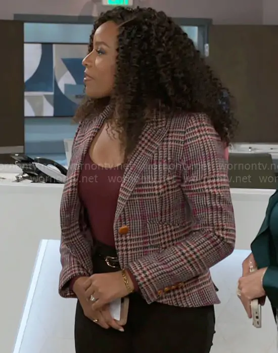 Naomi Hamilton Hawthorne (played by Arielle Prepetit) on Beyond the Gates on CBS was spotted wearing this burgundy plaid blazer on Beyond the Gates on Jan 21 2026's episode. Naomi's Jacket is the One Button Blazer in Berry Glen Check by Smythe.